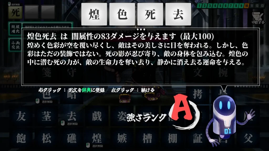 基本操作はマウス中心です。画面に並ぶ候補の漢字からクリックで四文字を選び、順序を決めて「確定」すると詠唱が始まり、AIがダメージや属性を判定します。対戦では同じ画面で漢字を取り合い、各自の呪文を作成して撃ち合います。モードは制限時間内に素早く作る速攻戦闘、事前に選んだ三十二字から運用する引継戦闘、連勝を狙う無限戦闘が収録されています。